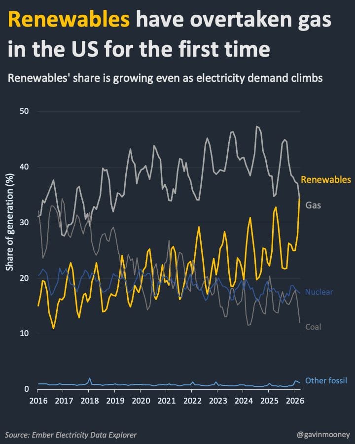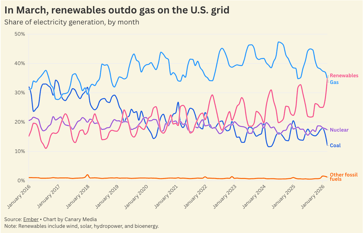 In March 2026, US renewables produced more electricity than natural gas across an entire month for the first time ever, according to Ember data cited by Canary Media.